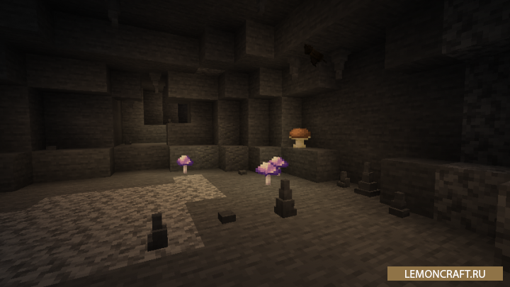 Мод на улучшенные подземелья Extended Caves внесет изменения в структуру подземелий, сделает их немного больше, а так же добавит небольшие заброшенные домики. Но самое интересное нововведение, это светящиеся грибы. Из данных грибов вы сможете создать еду, которая будет давать удивительный эффект для игрока. Так же в новых подземельях вы сможете встретить сталактиты, правда попадаются они очень редко.